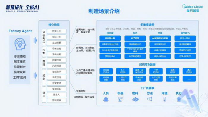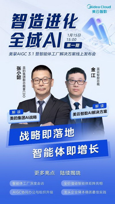 2026年2月2日,美云智数“智造进化 全域AI”线上发布会完美收官。 作为6场直播的系列发布会首发活动,美的集团副总裁兼CDO张小懿与美云智数总裁金江,分别从战略高度与实践层面,共同探索AI技术赋能制造业的创新路径:张小懿以“场景驱动+技术赋能”为核心框架,深入解析美的在AIGC领域的落地策略;金江则结合一线实践,详述美云智数如何通过数字化与AI技术的深度协同,打通制造业全价值链,推动产业降本提效。 亮点揭晓:美擎AIGC 3.1平台与“智能体工厂”解决方案在会上正式发布,同步展示AI在制造业全链路的业务创新,致力于为行业打造可复制的规模化转型标杆。 顶层方法论:以智能体重构产业价值链 美云智数提出“AIGC应用落地=场景×(数据+算力+算法)”,以“工具阶段—业务融合—智能体工厂”三步走为主线,围绕企业端到端流程(LTC/OTC/P2P/IPD/ICP)与订单交付(OTD)构建价值流管理(VSM)与指标体系,打通跨事业部与平台协同,形成“可视、可度量、可追责”的运营闭环。依托统一知识库、标准接口、模型治理与数据安全合规,美云智数实现多智能体协同、产线—车间—工厂三级实施稳步推进,破解业务碎片化,显著提升经营效率与交付稳定性。 五大智能体矩阵:研、产、供、销、服与通用场景全面落地 制造智能体:美云智数制造领域智能体通过Factory Agent赋能工厂,提升效率、降低损失、优化品质。如TPM智能体预测设备风险,优化维保计划;DMS智能体提升管理效率;模具智能体优化利用率,保障品质与效率。智能体覆盖工厂关键要素,助力企业构建高效、可持续的制造体系。 供应链智能体:面向“一致计划—智能供给—链接客户”,打通需求、计划、采购、库存、仓配与物流,统一可视与价值度量的运营底座。智能体融合内外部数据实现预测、诊断、优化与执行闭环,支持方案仿真与风险预警;异常场景下自动触发跨部门协同,明确责任与时间窗,提升预测准确度与交付准时率,优化库存周转并缩短决策周期。 营销智能体:围绕商品、政策、活动、经营四大核心场景,打造“商品专家、政策专家、经营助手、营销活动助手”。实现秒级商品问答/对比/推荐,一页纸、电子说明书与讲解视频自动生成;政策自然语言查询与返利预估,结合数字人“可看、可问、可算”;经营助手提供智能问数、库存分析、销售预测与补货提醒;活动助手模板化生成高质量海报/文案,5分钟出图。该智能体松耦合接入美擎CCS等系统,已在长沙、武汉、广深佛等地区落地,服务200+直营店长与400+实习店长,累计降本提效约210万元。 研发智能体:聚焦产品数据、项目管理、研发知识、工艺设计四大场景,采用“大模型语义理解+场景意图识别+规则引擎与专家规则”协同架构。产品数据智能体实现关键词/语音检索与报表自动生成;项目管理智能体跨系统取数与逻辑校验,自动生成“360日报”;研发知识智能体汇聚企标库、失败案例库、图文档库与设计规范库,提供方案推荐、经典案例与参数/标准推送;工艺设计智能体基于三维数模特征识别与成本预测模型,自动生成最优工艺路线并精准测算加工成本。 通用AIGC智能体(企业一站式通识智能体):面向企业研发与管理的“开箱即用、多模态适配、一站式管理、企业知识库、AIGC运营管理”五大能力。平台实现算力池化与异构算力管理,贯通模型生命周期(数据集管理、标注、训练、微调、评测、发布、接入),内外兼修的模型集成覆盖文本、语言、视觉、向量、视频、代码等算法。结合工业知识与自研知识处理算法,可准确支持需求拆解、方案生成、图纸与文档解析、测试用例生成、评审纪要与专利标准检索;内置高安全、精准的企业知识库与多维权限管控,构建研发知识图谱,显著提升知识召回与复用效率;通过AIGC运营看板与智能化评价体系,T+1呈现降本与提效成果。该通识智能体还能与合同审查、招聘面试、差旅协同等通用服务智能体联动,贯通研、产、供、销、管全流程。 统一平台与技术底座:让智能体跨系统自动协作 美擎AIGC 3.1.0与“智能体工厂”作为统一底座,围绕“技术统一→体验统一→数据统一→智能统一”全面焕新,聚焦精益交付、渠道化能力、工业知识沉淀与运营生态构建。平台在知识向量化与算法算力上持续迭代,完成“DeepSeek R1”满血版本地部署,MCP与智能体框架相继发布,支撑多智能体协同、移动化协同与全链路一体化。以统一技术栈、标准化流程与数据驱动,上连策略决策中枢,下接业务一线,让复杂协同从“人找数据”走向“AI主动服务”。 从试点到规模化:可复制、可运营、可量化 美云智数以“试点—推广—迭代”的科学路径推进智能体落地:分层架构与数据闭环为基座,统一知识库和接口规范为抓手,模型治理与数据安全合规为保障。在国内与海外市场,智能体矩阵持续提升交付准时率、库存周转与运营效率,兼顾成本与客户体验;AIGC运营看板让AI价值可量化、可追踪、可评估,为制造业提供可复制、可推广的智能化转型框架。 行业共建与生态协同 作为美的集团数字化和AI能力统一建设及对外赋能平台,美云智数致力于携手生态伙伴共建行业方案,推进供应链、制造、研发、财务等关键场景的智能体规模化部署,助力制造业实现从“有数据”到“用数据”,从“有人工智能”到“有业务智能”。依托美擎平台,美云智数将
