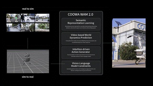 第一层:模型层 (The Model Layer)—— Coowa WAM 2.0 通用世界模型 针对物理世界中“长尾场景(Corner Case)不可穷举”与“零样本决策”的行业痛点,酷哇引入人类认知机理,构建了集“System 1 (直觉响应) + System 2 (逻辑推理)”于一体的双核驱动架构——Coowa WAM 2.0。该架构不再依赖单一规则,而是通过“快慢思考”的协同,实现了对复杂环境的类人化理解。第一层:模型层 (The Model Layer)—— Coowa WAM 2.0 通用世界模型 1.1 System 1:直觉行动系统 (Intuition-driven Action Generator) 在瞬息万变的开放环境中,直觉行动系统构成了机器人的“快思考”中枢。它不再依赖耗时的逻辑搜索,而是基于 Real-to-Sim-to-Real 闭环,利用 AIGC 技术在潜空间(Latent Space)中直接推演未来。 通过反事实推演(Counterfactual Reasoning),模型能基于直觉快速并行生成多组动作候选,并提前预判物理后果。这种机制相当于在行动前完成了亿万次虚拟试错,让机器人即便在突发状况下,也能凭借“经验直觉”生成最优解,实现 Drive 与 Work 的无缝耦合及实时响应。 1.2 System 2:UrbanVLM 宏观约束 (Vision-Language Model Constraints) 针对城市服务中低频但逻辑复杂的长尾场景(如理解交警手势、判断倒塌树木的优先级),酷哇引入自研的 UrbanVLM,承担宏观规划与因果约束的职责。它不直接输出控制信号,而是为直觉系统提供更高层的“语义围栏”。 • 云端深思 (UrbanVLM Large, 32B): 拥有320亿参数的多模态大脑,负责全局任务编排。它能读懂复杂的自然语言指令(如“优先清理堵塞排水口的积物,防止暴雨积水”),并将其拆解为具身智能可执行的原子任务序列。 • 端侧推理 (UrbanVLM Tiny, 3B): 部署在机器人边缘侧的小参数模型,负责百毫秒级的高维理解及策略约束。例如,它能通过语义分析识别出前方障碍物是一个“正在玩耍的儿童”,根据常识约束底层的策略使进行必要的保守礼让并停止工作。 此外,基于 WAM 底座,又衍生出两大核心引擎: ○ Drive AI(全场景移动引擎): 机器人的“双腿”。基于 End-to-End Transformer 架构,它不再依赖规则,而是基于推演结果在机动车道、辅道及楼宇通道中生成最优轨迹,在人车混流的博弈中实现“类人”的平滑通行。 ○ Work AI(VLA 协同作业引擎): 机器人的“双手”。基于 VLA (Vision-Language-Action) 架构,实现了视觉感知与机械臂动作的端到端对齐。通过学习数百万小时的环卫与物业作业真值数据,它能自适应调整清扫力度和机械臂轨迹,将运动控制误差收敛至厘米级。