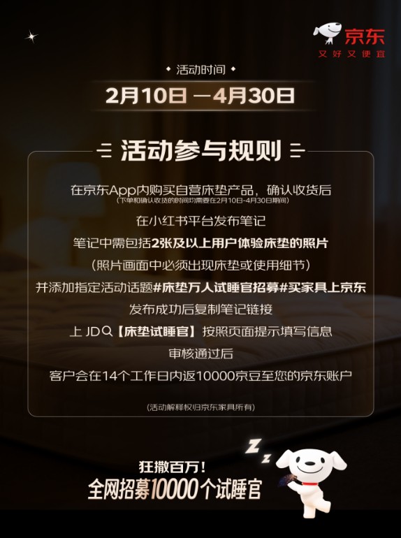 为让床垫选购更科学、更省心,京东家具将于2月10日面向全网启动“床垫试睡官”万人招募计划,诚邀10000名消费者参与真实试睡、分享体验反馈。此次招募不仅为参与者准备了丰厚京豆奖励,所有反馈更将用于完善京东床垫软硬度分级体系,为广大消费者提供更精准、更贴合实际需求的床垫选购参考,助力更多用户找到适配自身睡眠习惯的理想床垫。 长期以来,床垫选购缺乏统一标准,消费者往往只能凭感觉判断,容易陷入选购困惑。此前,京东已依据国家标准与京东品质测评实验室的数万张床垫实测数据,推出了“床垫软硬度系数”五档分级参考。此次发起试睡官计划,旨在进一步收集真实使用反馈,让软硬度分级更贴近不同用户的实际体感,帮助更多用户在下单时找到真正适合自身睡眠习惯的支撑类型。 在2月10日至4月30日活动期间,用户在京东购买自营床垫收货后,可在小红书发布图文体验笔记,内容需包含2张及以上床垫实物或使用照片,并添加话题#床垫万人试睡官招募#、#买家具上京东#。发布完成后,用户可复制链接,进入京东APP搜索“床垫试睡官”提交信息完成报名。前10000名符合要求的用户,每人均可获得10000京豆,奖励将于审核通过后14个工作日内发放。 参与活动收获奖励的同时,用户下单即可享京东家具“送、装、拆、收”的一站式省心服务。在京东购买自营床垫可现货速发,最快24小时送装到家,并且支持“100天免费试睡”,搭配一站式送装拆旧服务,无任何附加费用,可大幅降低消费者购买大件家具的决策压力与售后顾虑。恰逢京东家具年货节,即日起至2月23日,消费者下单不仅能参与“买家具抽宝马”活动,并享购物返现至高50%等多重优惠,补上加补低至5折,轻松实现高性价比的家居焕新。 从依赖主观感受选购,到依托真实数据与用户反馈建立科学标准,京东家具希望通过此次试睡官计划,与用户共同构建更贴合实际睡眠体验的软硬参考体系。每一份用户反馈,都是推动床垫选购走向透明化、科学化的重要力量。活动报名通道即将开启,用户可通过京东APP搜索“床垫试睡官”了解详情并参与,用真实睡眠体验为自己,也帮助更多人轻松地找到“刚刚好”的床垫。 中国首席商业资讯门户;更多内容请关注中国商业网各频道、栏目资讯。 免责声明:凡未注明来自本站的稿件和图片作品,系转载自其它网站,转载目的在于信息传递,并不代表本站赞同其观点和对其真实性负责 。 |