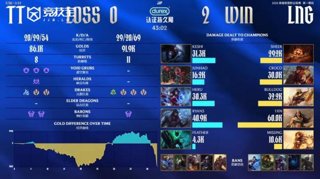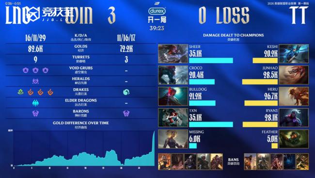 2026 LPL第一赛段今日继续进行骑士之路的争夺,首场比赛由TT对阵LNG。最终LNG以3-0横扫TT,成功晋级骑士之路败者组第二轮。按照赛制安排,LNG将在下一轮对阵iG,争夺最后一个季后赛席位。本场胜利也让LNG在第一赛段的大场比赛中豪取七连胜,成为目前LPL唯一保持全胜的队伍。 第一局BP 蓝色方TT:瑞兹、皇子、芸阿娜、凯南、牛头 红色方LNG:兰博、赵信、蛇女、库奇、妮蔻 首局比赛开始后,LNG下路对线直接打出巨大压制,上路虽然sheer兰博在补刀上处于劣势,却抓住机会反手单杀Keshi凯南,拿下一血。随着对线推进,LNG率先拆掉下一塔,整体对位经济优势已经来到2000以上。进入中期,LNG凭借领先的经济不断控下小龙,持续给TT施压。sheer兰博在下路再次完成单杀,比赛节奏彻底倒向LNG。TT几乎没有正面反抗空间,LNG顺利收下大龙并拿到风龙魂。随后河道团战中,TT试图在野区草丛埋伏强秒MISSING妮蔻,但妮蔻开启金身成功拖延时间,sheer兰博大招同时命中三人,LNG迅速反打完成收割,Croco赵信冲锋双杀收尾,LNG团灭TT,一波结束比赛,轻松拿下首局。 第二局BP 蓝色方TT:阿狸、蔚、贾克斯、锤石、厄斐琉斯 红色方LNG:沙皇、猴子、纳尔、希维尔、曙光 第二局前期,Croco猴子在河蟹团中抢到6级,帮助LNG打赢关键团战,队伍很快建立起优势,中期经济一度领先到5k。不过随后MISSING曙光和sheer纳尔连续出现失误,TT抓住机会连续拿下两条大龙,一度将局势扳回,比赛悬念陡增。关键阶段Feather锤石被抓,LNG强行稳住局面,将比赛拖入远古龙阶段。多波团战中,Keshi贾克斯尽力给到控制,为Ryan3厄斐琉斯创造输出空间,TT一度看到了翻盘希望。但LNG这边1xn希维尔在后排持续打出高额伤害,Croco猴子多次关键控制留人,同时成功打断蔚的进场。决胜龙魂团中,Ryan3厄斐琉斯在绿紫刀形态下被1xn希维尔配合sheer小纳尔集火击杀。LNG拿下土龙魂和第三条大龙后没有再给TT机会,直接一波结束比赛,取得赛点优势。 第三局BP 蓝色方LNG:阿萝拉、女枪、芮尔、巨魔、永恩 红色方TT:维鲁斯、岩雀、泰坦、纳亚菲利、格温 第三局对线期走势与前两局相似,TT下路再度出现问题,Ryan3维鲁斯连续两波阵亡,让对位的1xn女枪迅速发育起来,LNG再次打出2k以上的对位经济领先。中期LNG成功断掉TT的小龙节奏,但随后Croco巨魔在下路强行开团失误,加上MISSING芮尔在河道被抓,连续送出人头,TT趁机拿下大龙,将经济差距抹平。决胜阶段的远古龙团前,MISSING芮尔再次阵亡,LNG一度少人作战。但凭借阵容优势,LNG成功拖到辅助复活,随后强杀泰坦并抢下远古龙,直接团灭TT,终结比赛。至此,LNG以3-0淘汰TT,顺利晋级骑士之路第三轮。 LNG凭借稳定的对线能力和关键团战中的执行力,在骑士之路继续高歌猛进。而在职业赛事之外,竞 技 宝也持续深耕电竞领域,打造了竞 技宝春季杯S1、竞 技 宝春季杯S2、斗鱼csgo主播联赛、1988杯中单之神争霸赛等多项品牌赛事,为电竞爱好者提供了更多高质量、多层次的竞技舞台与观赛体验。 中国首席商业资讯门户;更多内容请关注中国商业网各频道、栏目资讯。 免责声明:凡未注明来自本站的稿件和图片作品,系转载自其它网站,转载目的在于信息传递,并不代表本站赞同其观点和对其真实性负责 。 |