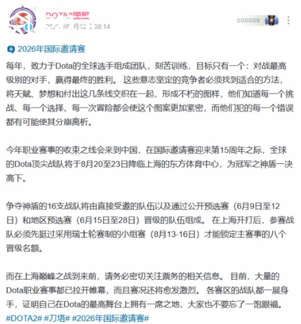 DOTA2官方正式公布2026年国际邀请赛相关信息,全球顶级战队将再度集结,为冠军神盾展开终极对决。作为赛事15周年的重要节点,本届TI将来到中国上海举行,这不仅是年度最高规格的电竞盛典,也象征着DOTA职业赛季的最终收束与荣耀加冕。 赛事时间与整体赛程官方确认,本届TI15完整晋级路径将从6月开启并持续至8月主赛事阶段,具体安排如下: 公开预选赛:6月9日-12日 地区预选赛:6月15日-28日 瑞士轮小组赛:8月13日-16日 主赛事:8月20日-23日 16支参赛队伍将由直邀战队与预选赛晋级队伍共同组成。所有队伍抵达上海后需先通过瑞士轮小组赛考验,只有前8名才能晋级最终主赛事阶段,向冠军盾发起冲击。 TI15延续经典邀请+预选并行体系:直接邀请名额通常授予过去一年赛事成绩突出、整体排名靠前的顶级战队。地区预选赛晋级名额则给予各赛区战队公平竞争机会,让更多潜力队伍有机会登上世界舞台这种机制既保证赛事竞技强度,也让比赛充满不确定性与观赏性,新秀黑马与传统豪强同台竞技始终是TI最大魅力之一。 今年TI不仅是年度总决赛,更是赛事15周年纪念节点。上海东方体育中心将成为全球DOTA顶尖战队决战舞台。中国作为东道主拥有成熟赛事承办经验、庞大玩家群体以及深厚电竞文化基础,为赛事成功举办提供强大保障。随着电竞产业持续高速增长,TI15也被视为推动行业进一步商业化与主流化的重要节点。大型国际赛事的举办将吸引更多品牌、资本与媒体关注,从而带动整体生态发展。对于职业选手来说,TI象征着最高荣誉与终极梦想;而对观众而言,这不仅是一场比赛,更是一场属于整个DOTA社区的年度庆典。 随着各大赛区赛事陆续展开,争夺TI席位的竞争已经提前升温。每一场胜负、每一次操作,都可能成为通往上海决赛舞台的重要一步。而想要持续掌握赛事动态、深度解读以及更多专业电竞资讯,关注像竞 技宝这样的行业平台也逐渐成为不少玩家获取一手信息的重要方式——作为液体百科亚洲区长期战略合作伙伴,其内容与赛事生态覆盖同样紧贴顶级赛事节奏。 中国首席商业资讯门户;更多内容请关注中国商业网各频道、栏目资讯。 免责声明:凡未注明来自本站的稿件和图片作品,系转载自其它网站,转载目的在于信息传递,并不代表本站赞同其观点和对其真实性负责 。 |