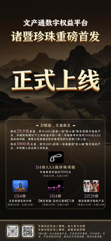 浙江诸暨,2026年3月 作为“西施故里、珍珠之都”,浙江省诸暨市持续推动特色产业与文旅融合发展。为进一步提升珍珠资产流动性、活化地方文旅资源,重磅推出“诸暨珍珠文旅数字权益产品”,首期产品将于2026年3月14日13点14分在“文产通数字权益平台”正式发布。 以“珍珠实物+文化IP+文旅消费权益”为核心,通过技术创新实现资产数字化封装,是诸暨在推动真实世界资产(RWA)数字化应用方面的一次重要实践,为传统产业与文旅资源赋予新的发展动能。 紧扣发展需求,创新资产数字化模式 诸暨珍珠产业底蕴深厚,西施文化IP优势突出,但同时也面临优质珍珠资产流通效率有待提升、文旅消费存在季节性波动等现实课题。本项目通过数字技术,将珍珠实物、西施文化数字内容以及本地酒店、景区的消费权益进行有机结合,形成具有收藏价值与实用功能的数字权益产品。这一模式不仅有助于拓宽珍珠产业的展示与流通渠道,也能通过数字预售机制助力文旅板块平稳运营,为后续产业与金融资源的对接积累经验。 首期产品亮相,融汇收藏价值与消费体验 首期发行将推出两类数字权益产品,兼顾收藏属性与文旅体验: “珍珠文旅典藏礼盒”:限量214份。每份内含专属系列数字藏品、高品质珍珠实物,以及合作酒店与景区的专项消费权益,致力于为爱好者提供融合文化收藏与线下体验的精品之选。 “珍珠文旅数字盲盒”:限量发行,体现趣味性与大众参与性。用户可获得不同等级的数字藏品,并有机会额外获得珍珠实物、酒店优惠或景区门票等线下权益,增强活动的互动性与惊喜感。 本次发行配套了相应数量的珍珠实物及文旅消费权益,确保数字权益可兑现为切实的线下体验,实现虚拟收藏与实体经济的双向链接。 推动数实融合,助力产业长效发展 通过数字权益这一形式,提前锚定文旅消费意向,助力本地服务业均衡发展;同时,为珍珠产品提供可追溯、可鉴证的数字化呈现方式,有利于提升品牌公信力与市场影响力。 发售在即,敬请期待 2026年3月14日13点14分,这个充满寓意的时刻,诸暨珍珠文旅的数字之旅将正式启航。此次发售不仅是诸暨特色产业与文旅资源的一次创新性价值呈现,也为广大消费者、藏家及投资者提供了一个参与地方特色资产数字化进程的独特机遇。所有产品将通过“文产通数字权益平台”进行发售,敬请关注。 为让广大消费者、藏家及爱好者能及时获取项目最新动态、参与互动交流,我们已建立官方社群。欢迎扫描下方二维码,加入“诸暨珍珠文旅数字权益交流群”,与我们共同见证并开启这场“珍珠+文旅”的数字化创新之旅。 发售在即,敬请期待与加入! 中国首席商业资讯门户;更多内容请关注中国商业网各频道、栏目资讯。 免责声明:凡未注明来自本站的稿件和图片作品,系转载自其它网站,转载目的在于信息传递,并不代表本站赞同其观点和对其真实性负责 。 |